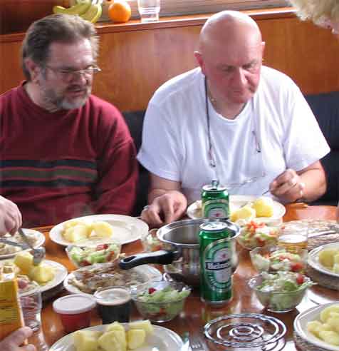 Zum Abendessen werden wir noch einmal von Käpt'n Dietrich verwöhnt: Es gibt frischen Fisch (Kabeljau, von Ede in Athlone eingekauft) mit Salzkartoffeln und Salat.
